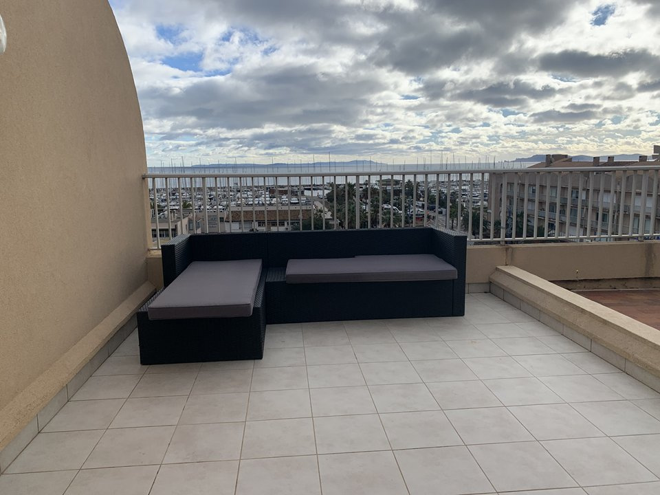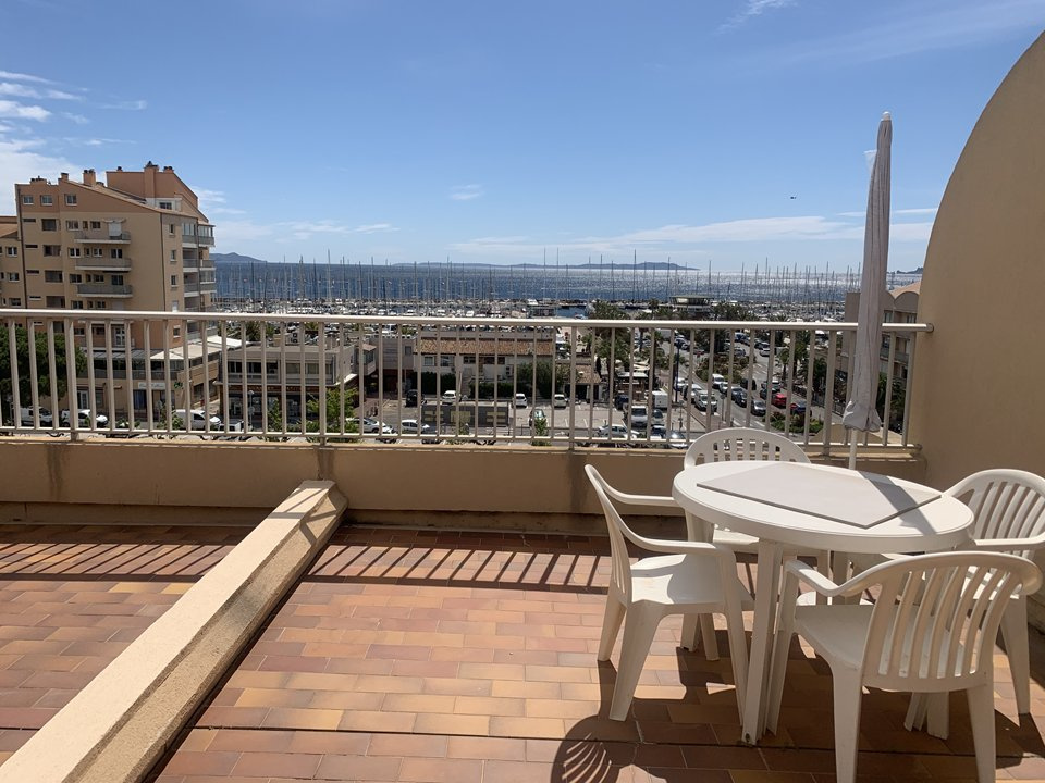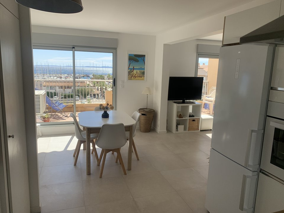 HYERES PARC - Résidence de vacances au coeur du Port de plaisance, commerces et plages à proximité, meublé pour 5 PERSONNES , rénové , meublé avec goût. deux duplex reunis, parking au sous/sol privé. au 4 ème étage avec ascenseur 67M² + 2 Terrasses 15M² et 28M² VUE MER. composition: une entrée avec une salle de bains avec WC ainsi qu'une salle d'eau avec WC. Dégagement avec coin cuisine équipé de four, four micro-ondes plaques de cuisson, réfrigérateur conservateur , lave vaisselle, lave-linge un séjour meublé avec canapé et TV ouvrant sur terrasse avec vue mer Meublé avec parasol. coin repas , un lit d'appoint pour une personne. A l'étage : 2 chambres avec lit en 140 et penderie, donnant sur solarium avec salon de jardin vue mer, Port et ILES D'OR r; deux places de parking au s/sol.Le linge de maison n'est pas fourni.possibilité de le commander.